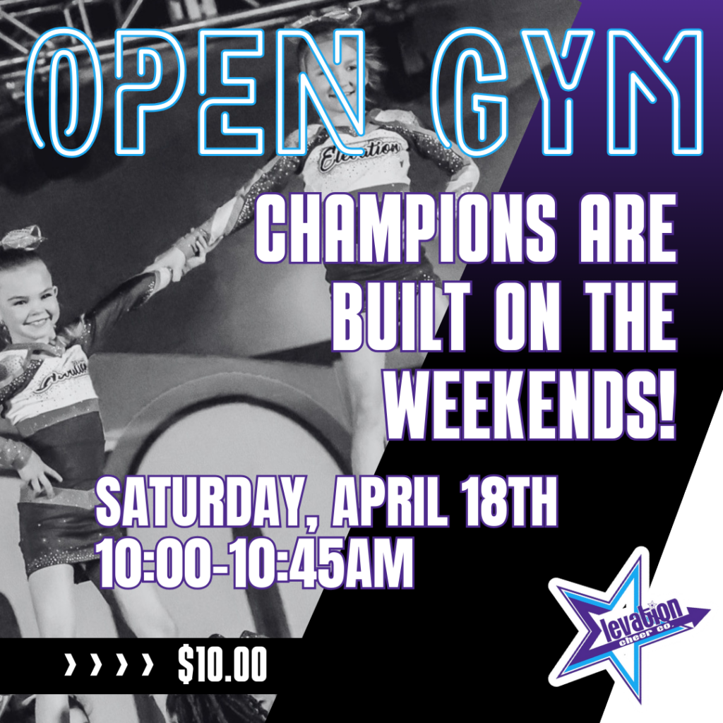 Open gym will be from 10-10:45am. Athletes who attend will be able to independently work on tumble skills in an open gym format. Athletes can receive a spot but there will be no individualized instruction during this time. This opportunity is meant to polish existing skills and get additional reps to build confidence with their current skills. It is a good opportunity for athletes to receive additional reps on their existing skills if they are unable to commit to an additional tumble opportunity throughout the week.