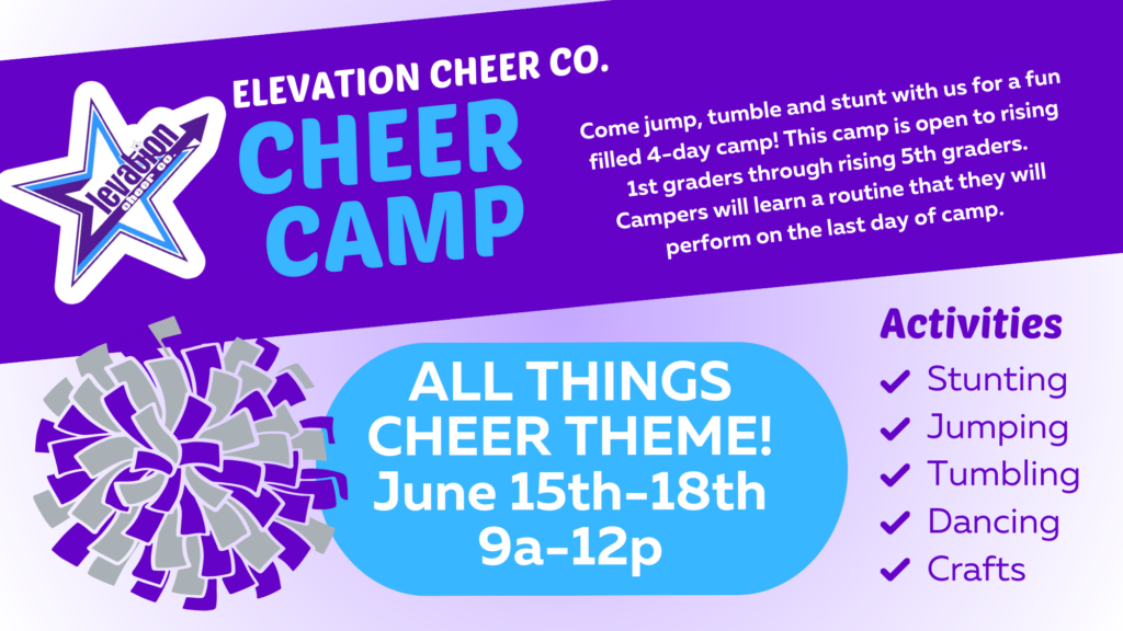 Looking to master a new tumbling skill? This 4-day camp, open to rising 2nd graders and up, will offer your athlete lots of repetition while focusing on developing technique, strength and body control needed to perform those skills. Campers need to bring a snack!