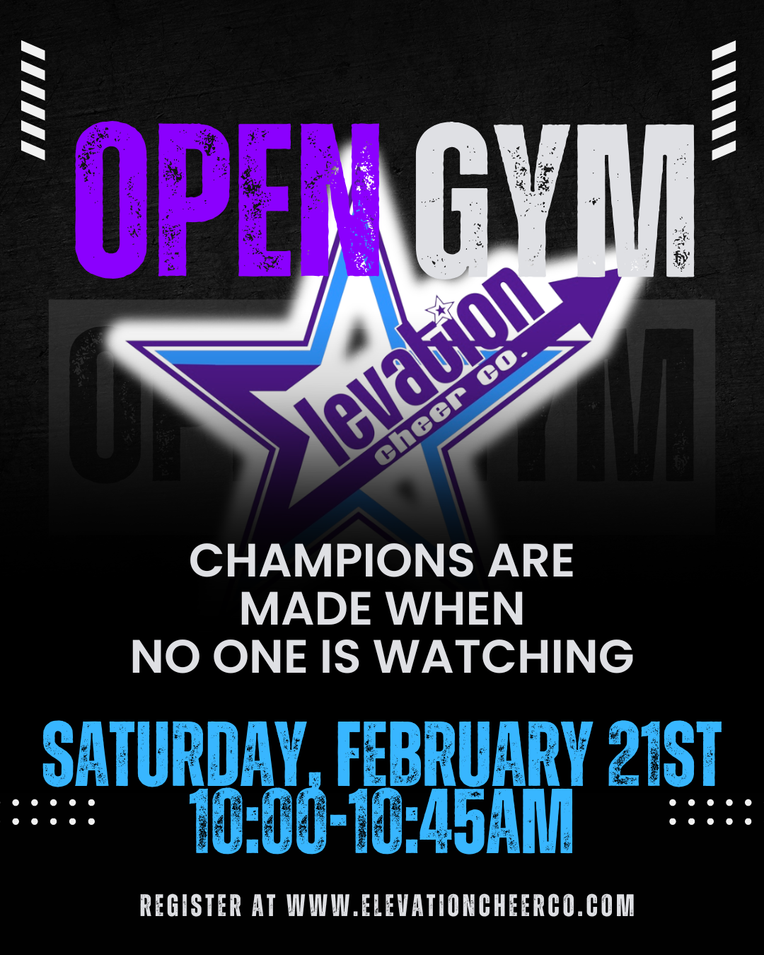 Join us for Fun Gym! 6:00-8:00pm (Drop off & Pickup- Lobby will be closed) $20 for members ages 7 & up 2 slices of pizza and drink included *Athletes that are non members must pay the registration fee to become a member to attend. Elevation Cheer Co. 625 Corporate Circle Salisbury, NC 28147