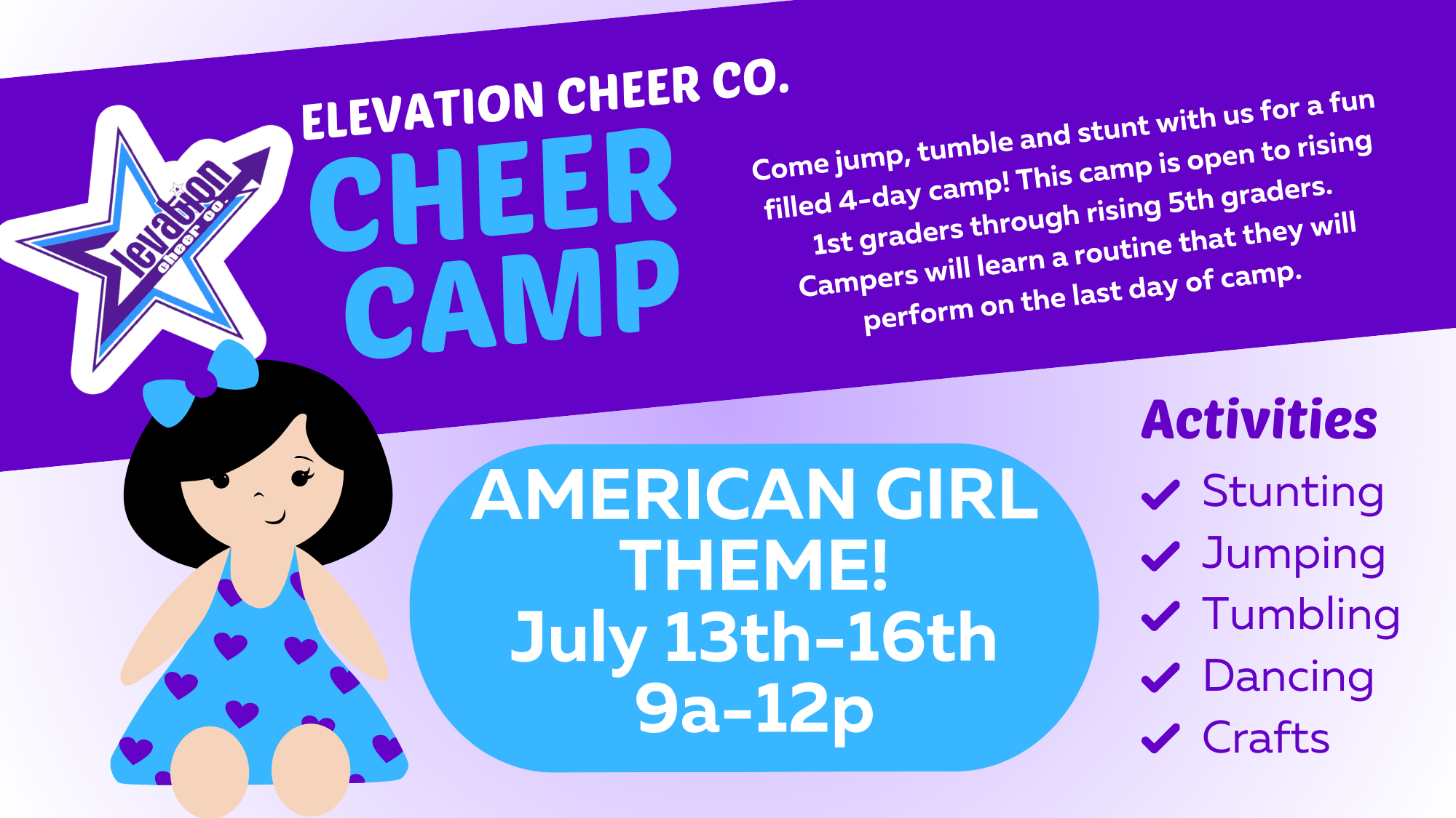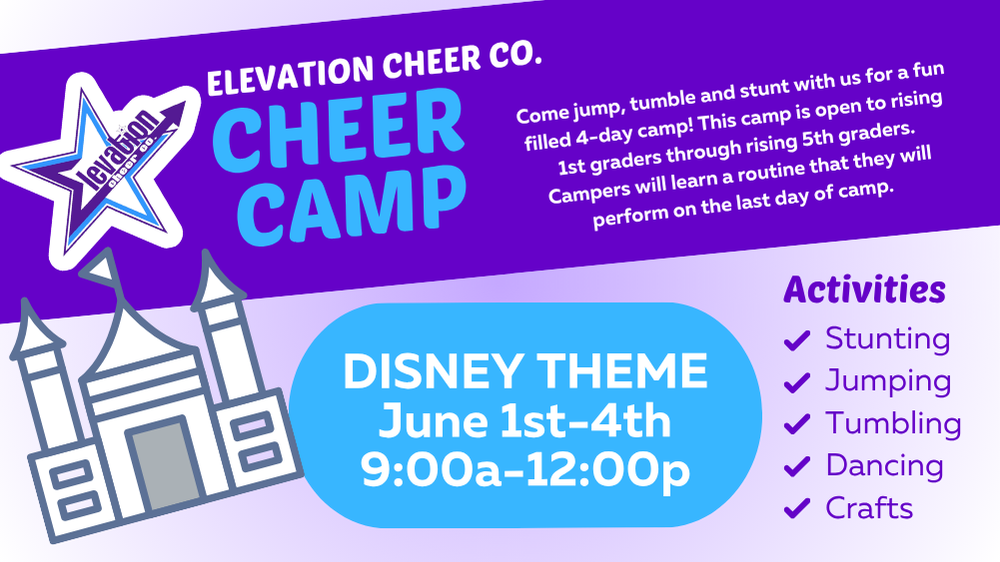 Come jump, tumble and stunt with us for a fun filled 4-day camp! This camp is open to rising 1st graders through rising 5th graders. Campers will learn a routine...