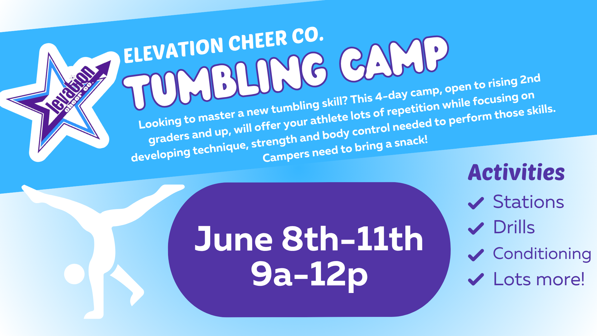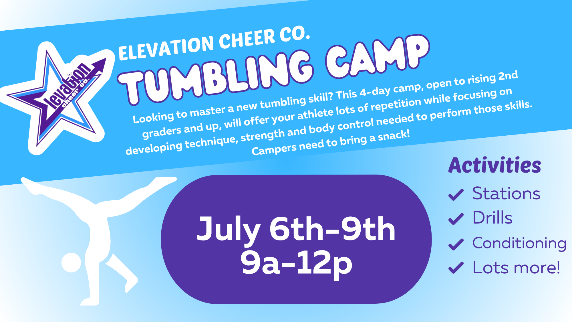 Looking to master a new tumbling skill? This 4-day camp, open to rising 2nd graders and up, will offer your athlete lots of repetition while focusing on developing technique, strength...